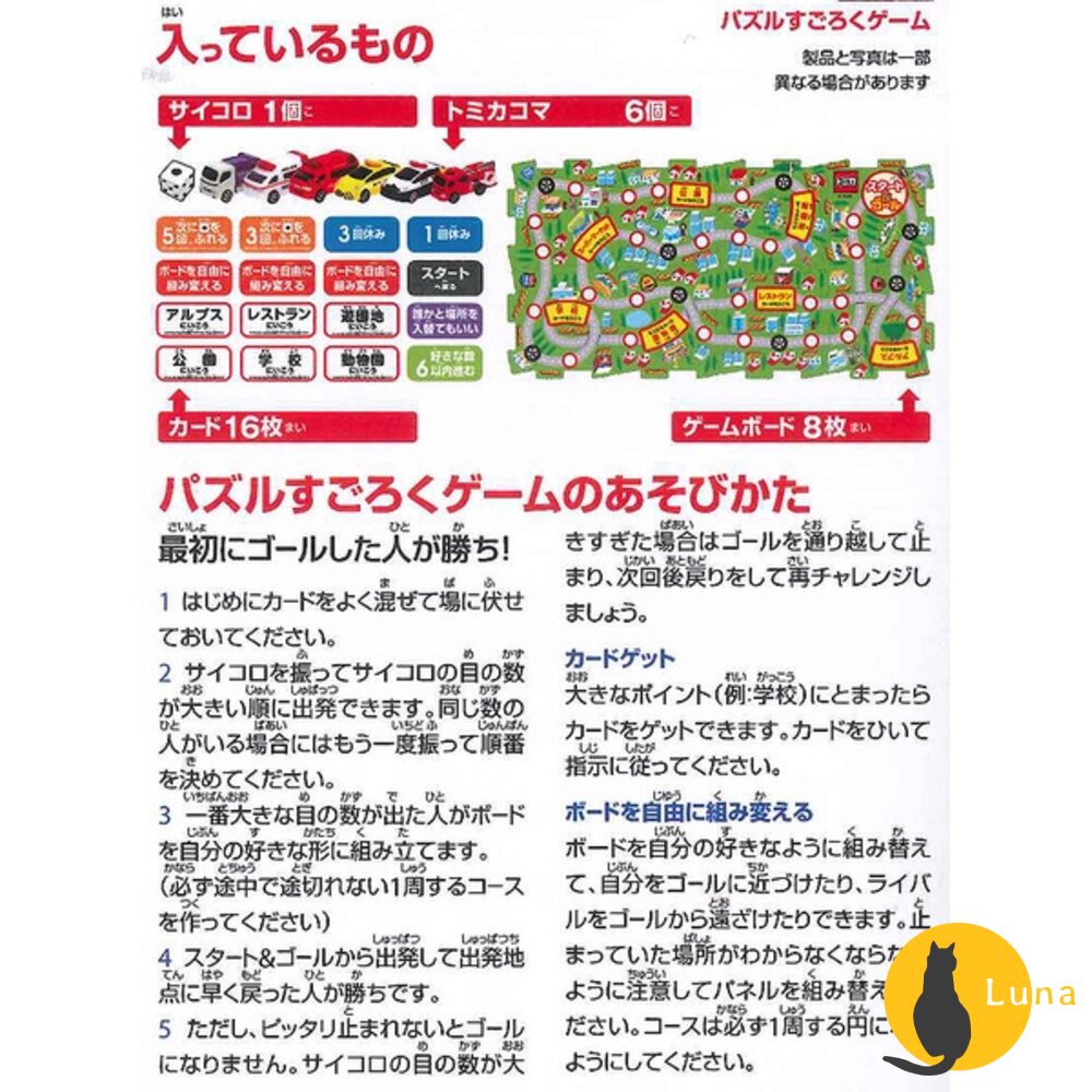 內容物:骰子*1、Tomica小車*6、卡片*16、遊戲板*8 (如圖所示,說明不足部份以收到實品為準)
