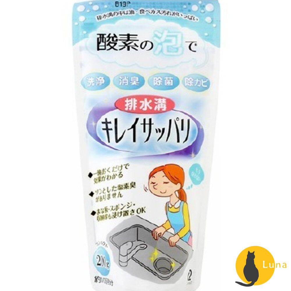 1. 先沖洗欲使用的排水口,加入1杓20g的清潔粉,若是髒汙嚴重可加2杓
