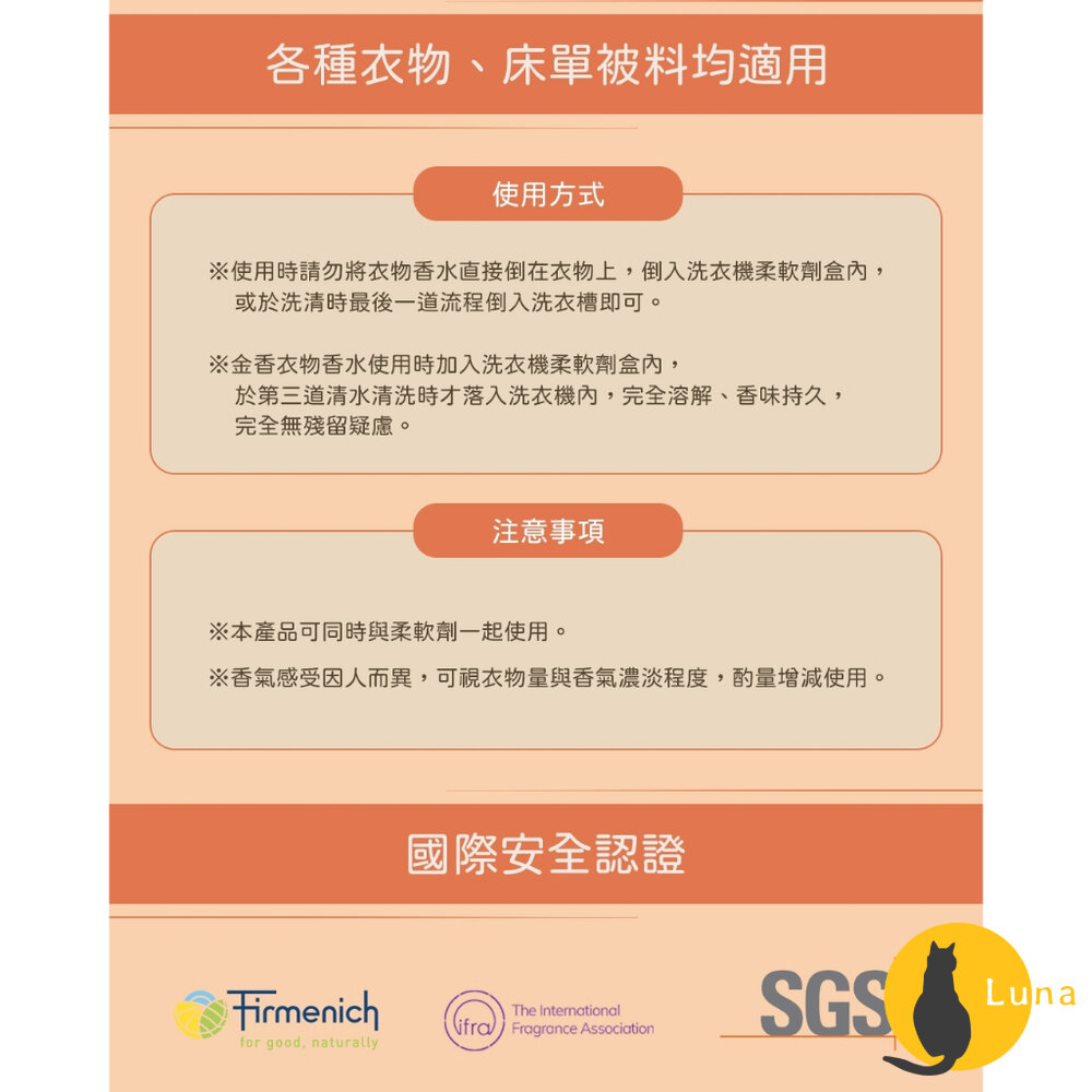 ★使用方式:請依衣物多寡將適當的衣物香水倒入洗衣精<柔軟劑盒內>,勿直接與洗衣精(球)一併放在衣物上。