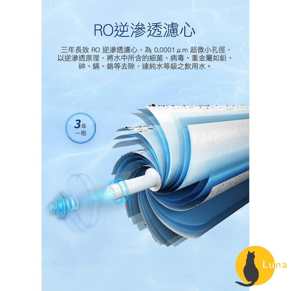 💡RO逆滲透濾芯,為0.0001um超微小孔徑,以逆滲透原理將水中細菌、病毒、重金屬等去除