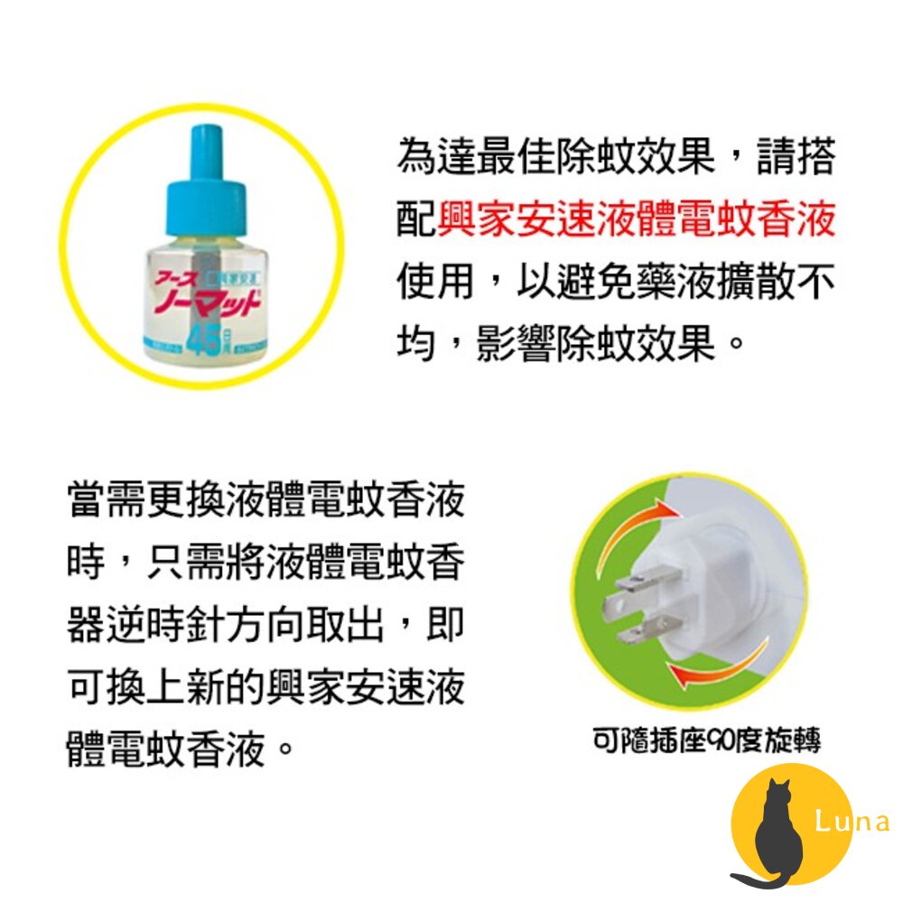 5. 為達最佳效果,請搭配興家安速液體電蚊香液使用,以避免藥液擴散不均,影響除蚊效果。當使用時,將電蚊香器開關打開後,待作用達30分鐘後再進入房間。平日可將本器置於房門入口或玄關插座上,可更有效防止蚊蟲飛入室內。
