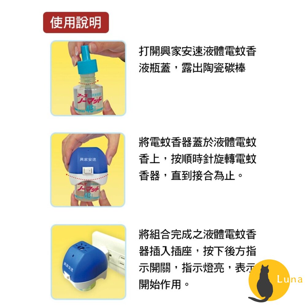 取出補充瓶打開瓶蓋,放入液體電蚊香器中旋緊,將液體電蚊香器之插頭插入插座內,並使電蚊香器維持直立狀態,按下開關按鈕即開始作用。