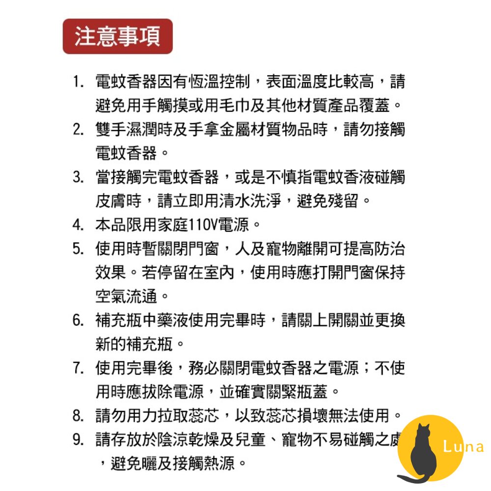 1. 電蚊香器因有恆溫控制。表面溫度比較高,請避免用手觸碰或用毛巾及其他材質產品覆蓋後取用。