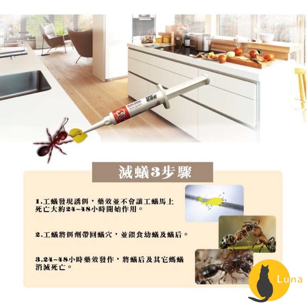 ※ 可用量:一支5g的螞蟻絕約可施打20-25點,家中螞蟻較多或是坪數較大,建議可以一次購買兩支5g餌劑。
