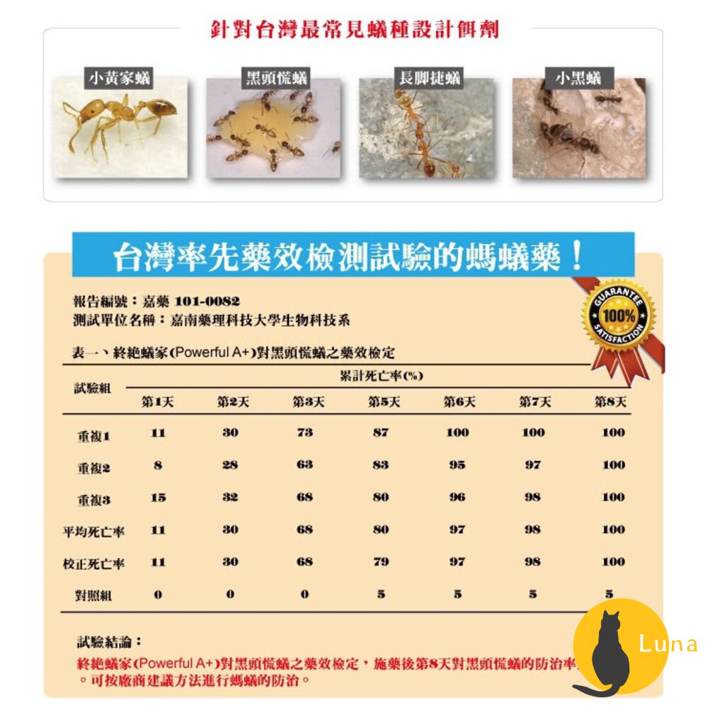 A : 螞蟻絕是針對殺螞蟻所設計的產品,對其它寵物如貓狗而言,其毒性相對較低,傷害也相對不高。其次,貓狗平日的習性跟螞蟻不同,餌劑施點處會根據螞蟻習性施用,貓狗相對不容易接觸!