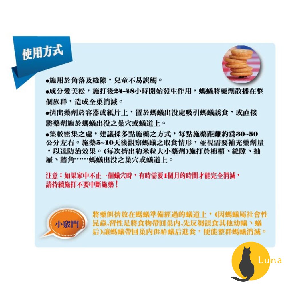 ※ 施點位置:施點在水槽下方角落、瓦斯台下方、櫥櫃角落、餐桌下方角落、電話背面、寵物便盆、花盆..等螞蟻易於出沒處。