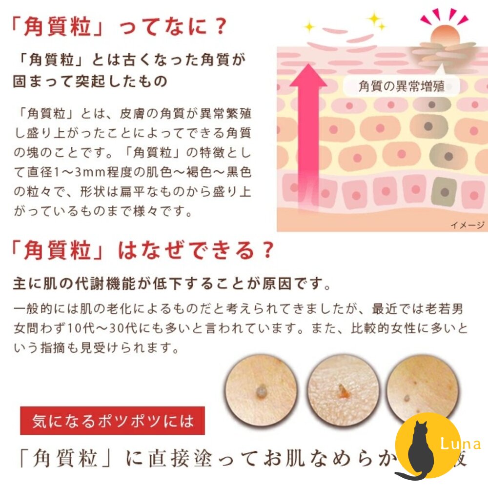 使用說明:適用臉、肩膀、頸部及胸口的肉芽,配合沐浴後使角質軟化或洗完臉後,只須取適量1-2滴,將其塗在臉部或頸部即可。開封後請於6~12月內用完。