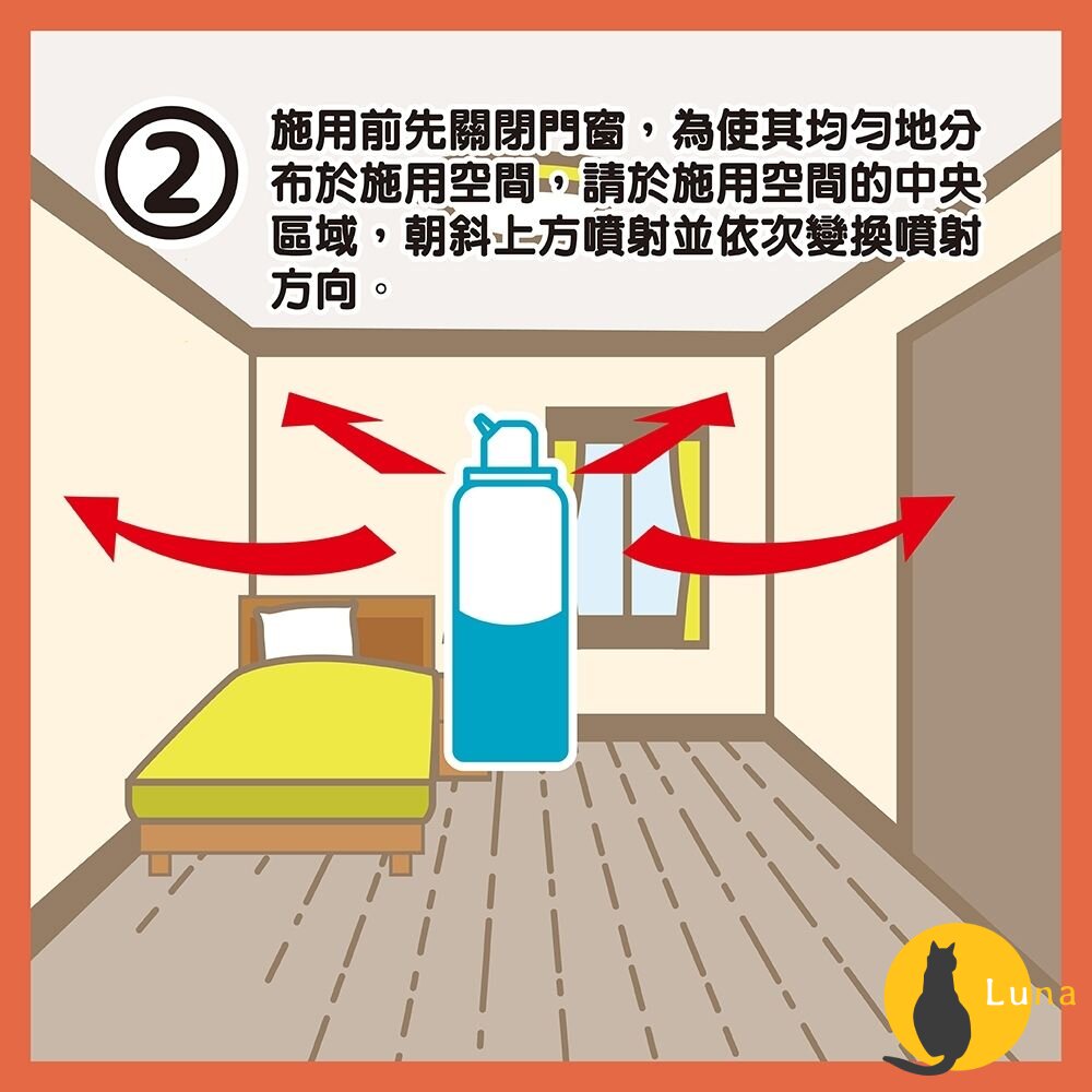 3. 施用前請關閉門窗,為使其均勻地分布於施用空間,請於施用空間的中央,朝斜上方噴射並依次變換噴射方向。