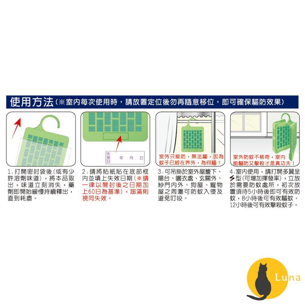 ●使用方式:直接將本品吊掛或放置於蚊子易出沒之處,例如:陽臺、玄關、紗窗門內、外出入口處。