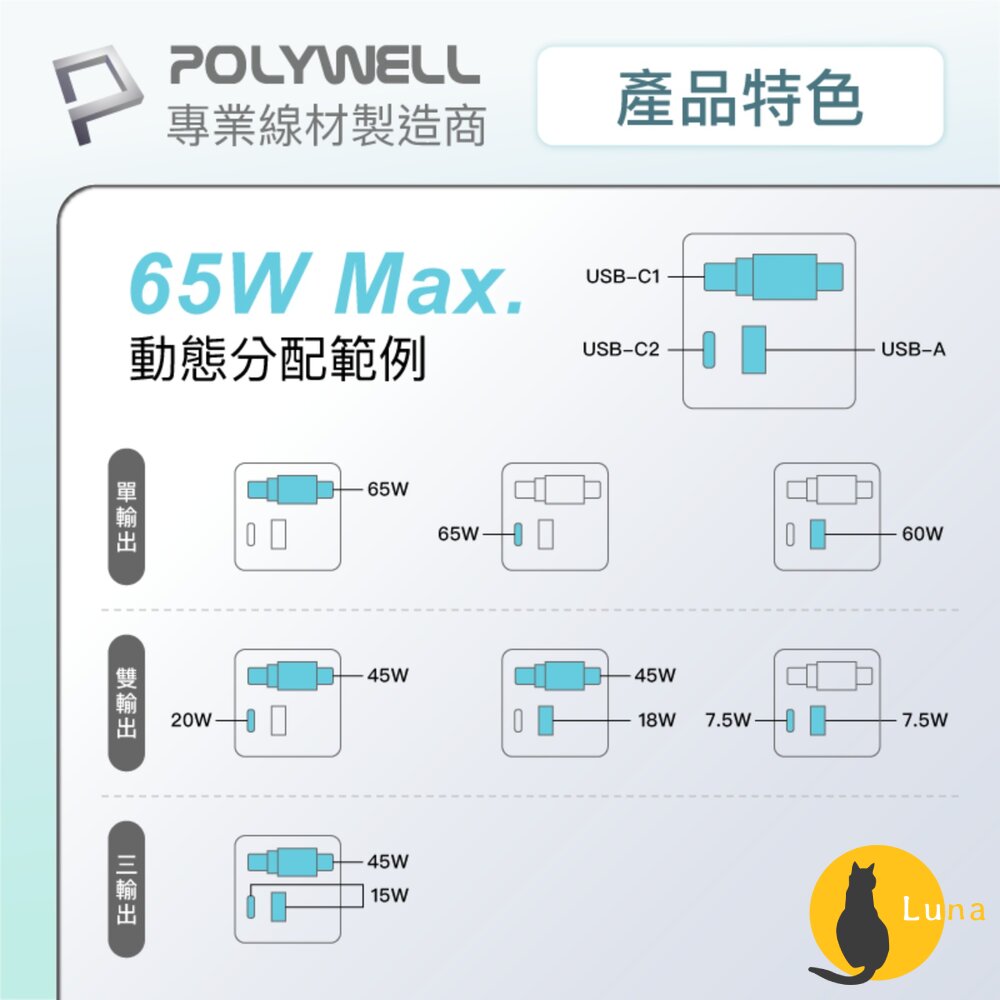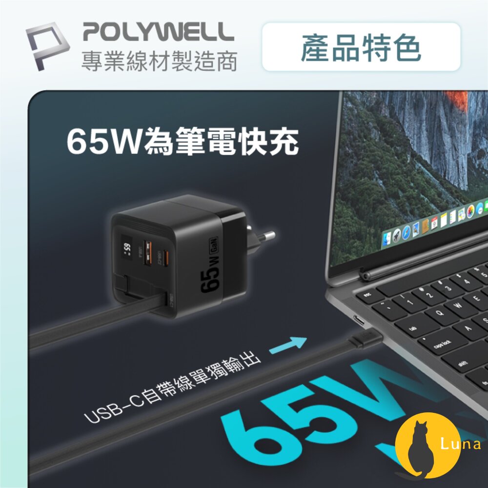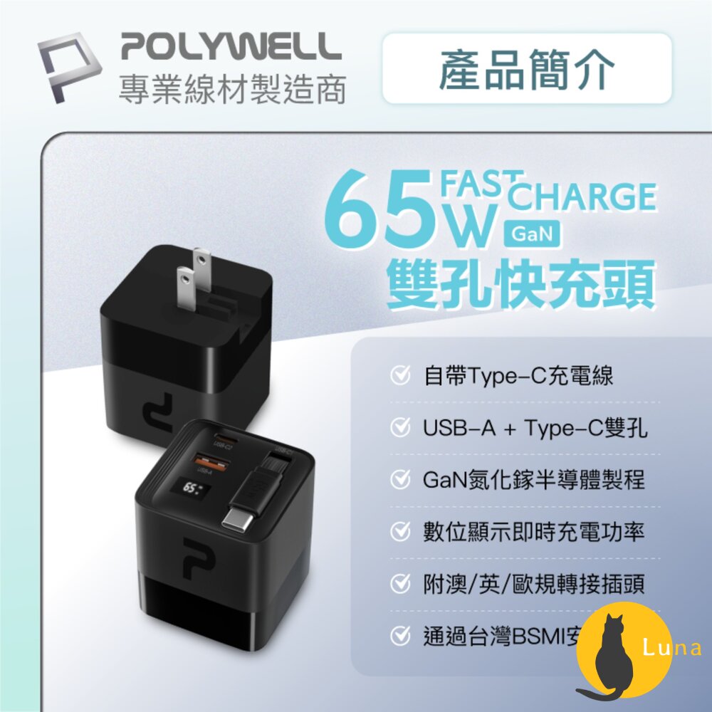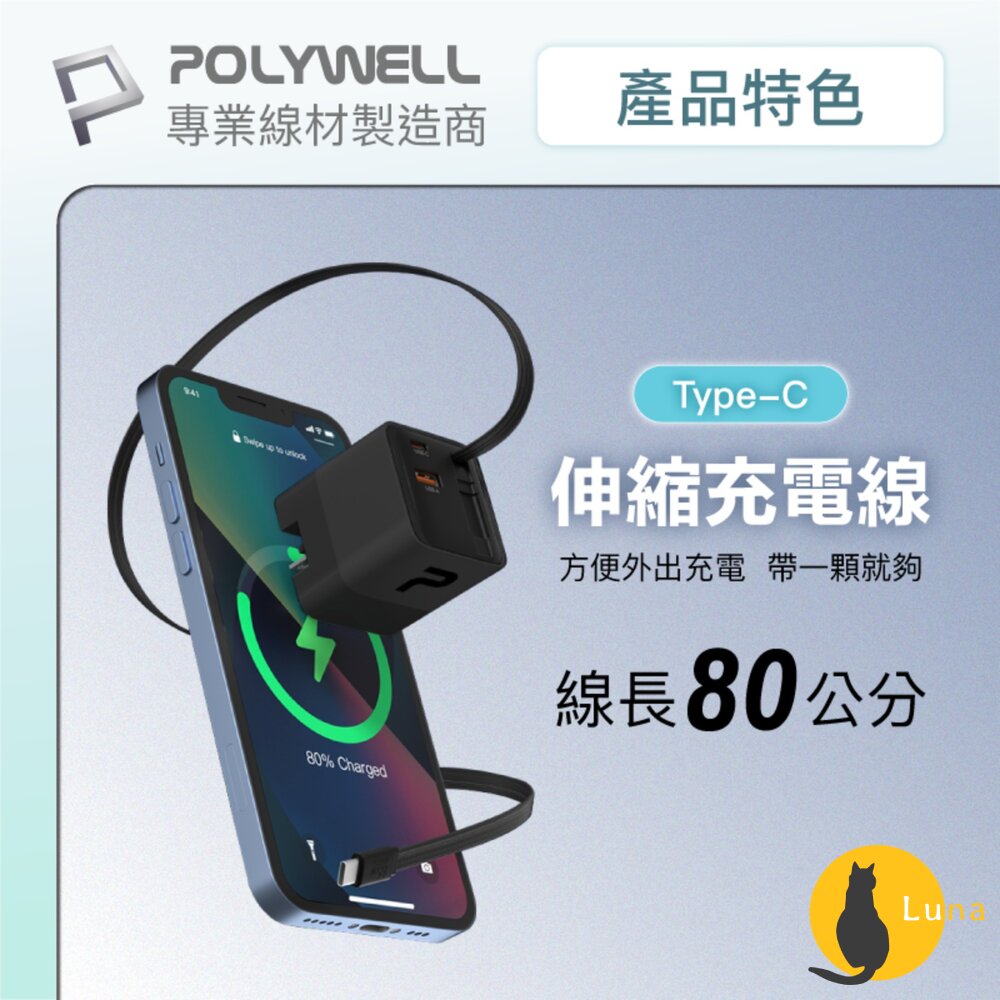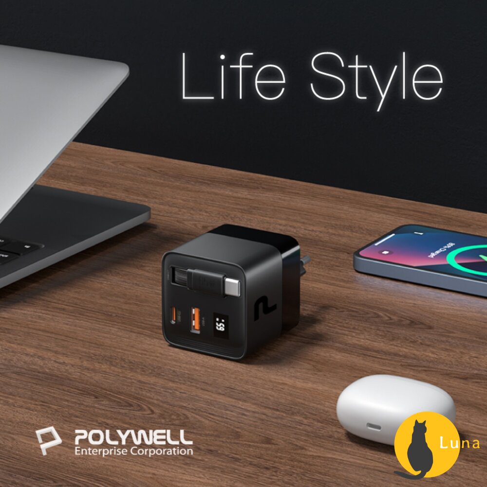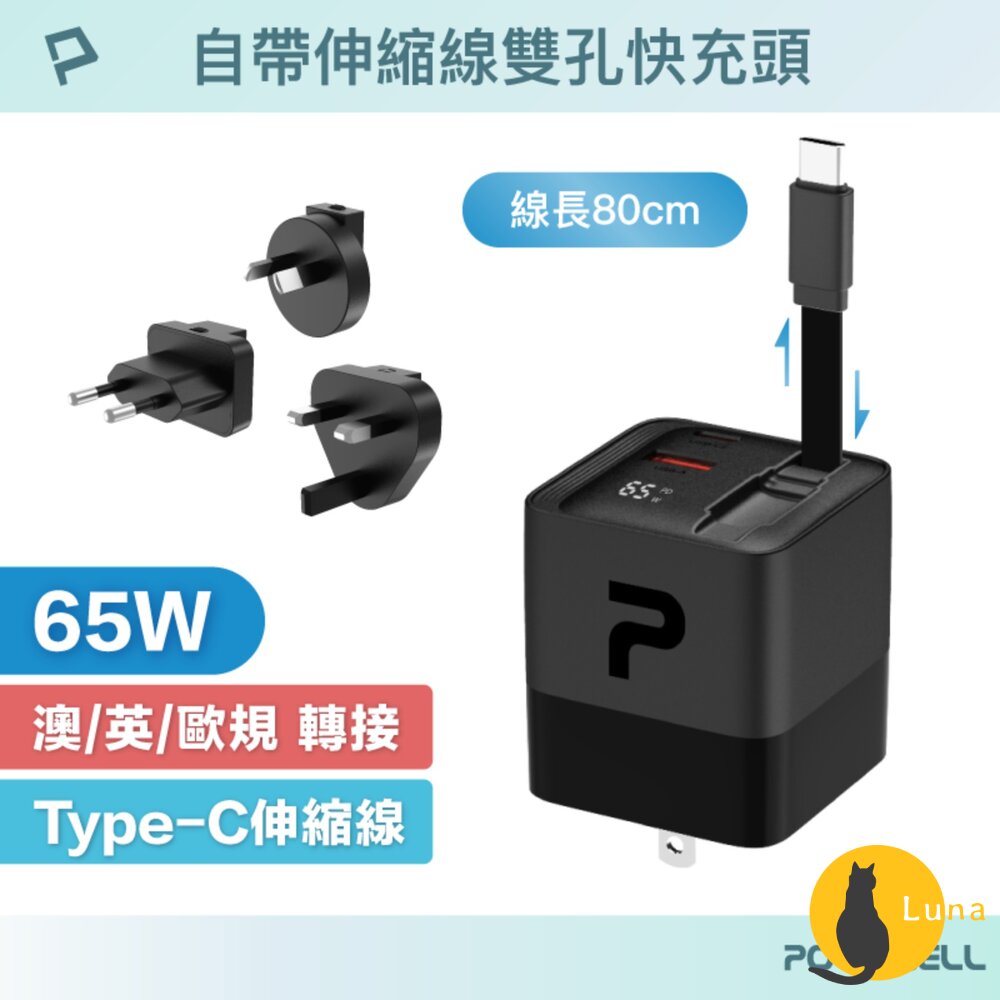 🌟POLYWELL 65W自帶伸縮線雙孔快充頭🌟