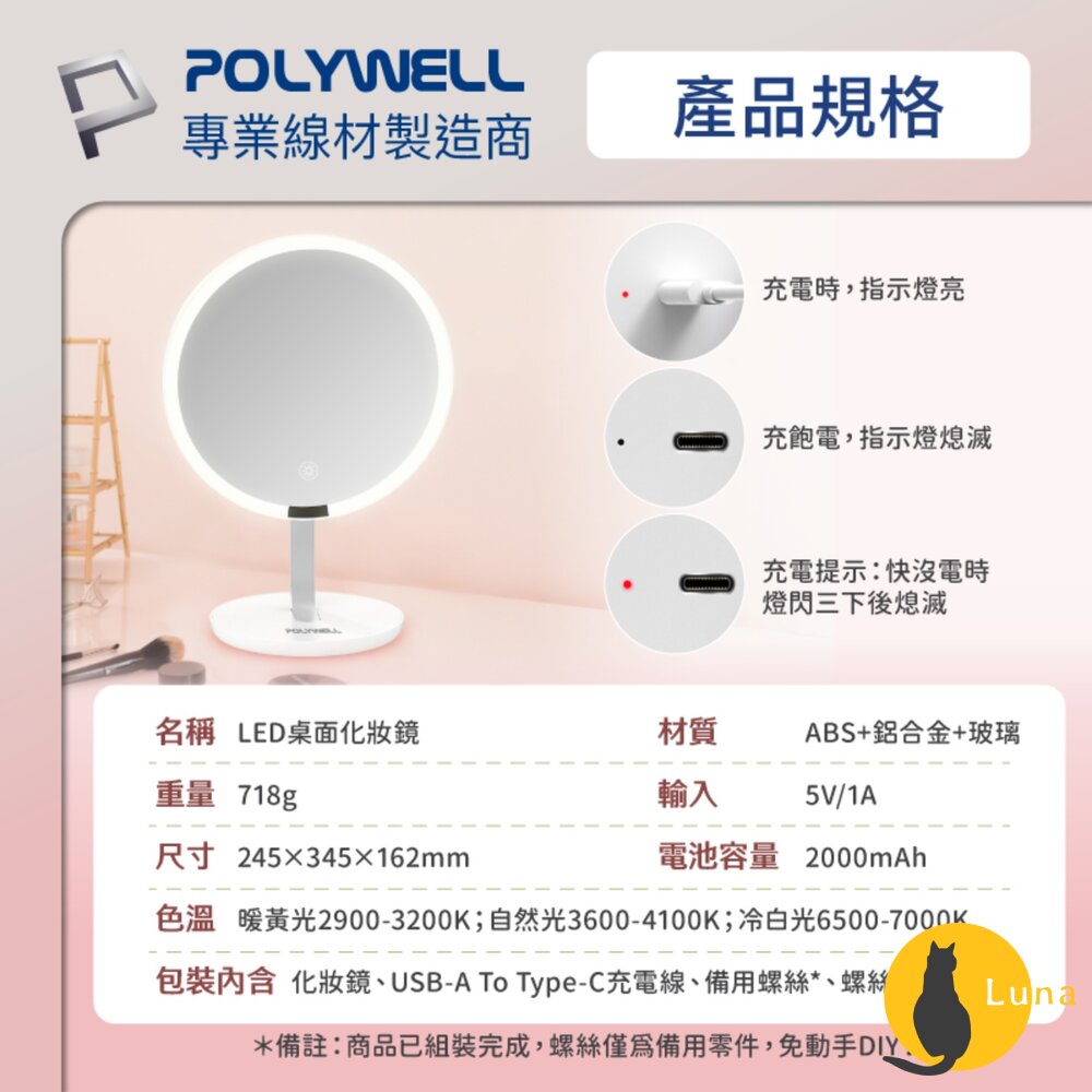 ※包裝內含:化妝鏡、USB-A To Type-C充電線、備用螺絲*、螺絲起子