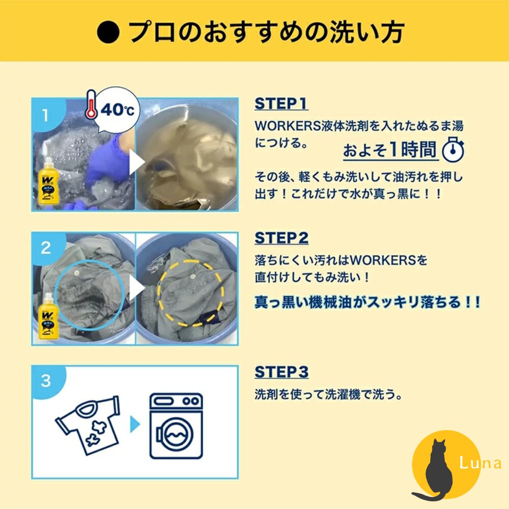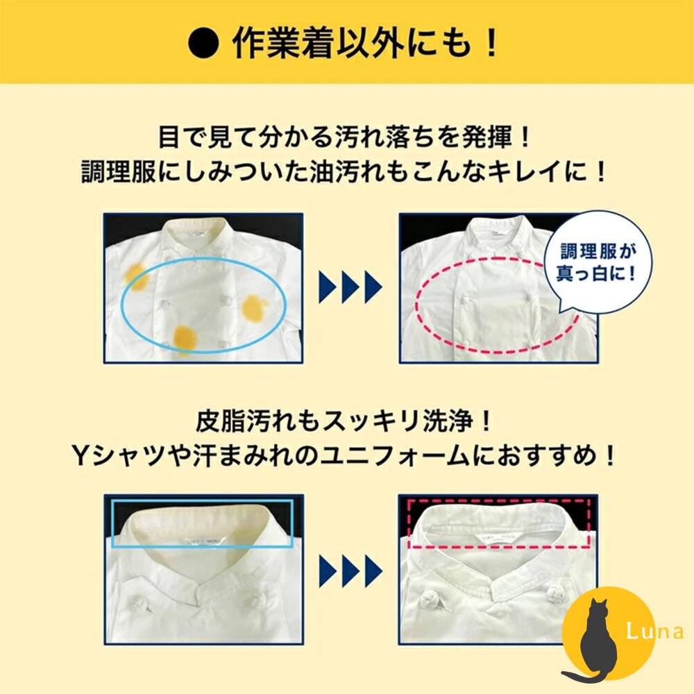 1. 將衣物浸泡於含有洗劑的溫水中約 1 小時,再將原液直接塗抹於汙漬處揉搓,最後放入洗衣機洗滌。